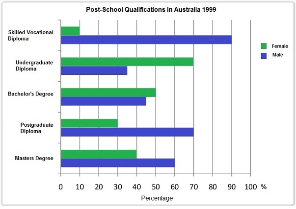The chart below shows the different levels of post school qualification in Australia and the proportion of men and women who held them in 1999.