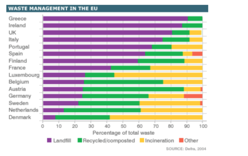 The bar chart shows the percentage of waste that is recycled, put into landfill or incinerated in various EU countries.