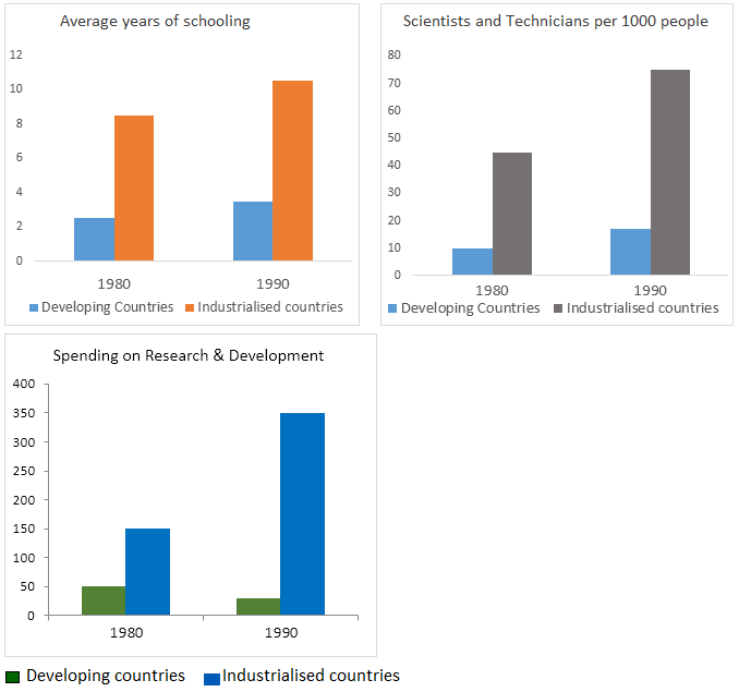 The three bar charts show average years of schooling, numbers of scientists and technicians, and research and development spending in developing and developed countries. Figures are given for 1980 and 1990.