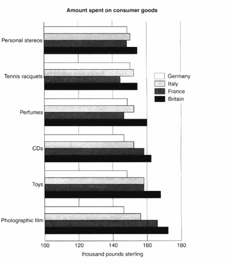 The figures for spending on toys were the same in both France and Italy, at nearly £160,000. However, while French people spent more than Italians on photographic film and CDs, Italians paid out more for personal stereos, tennis racquets and perfumes. The amount spent by French people on tennis racquets, around £145,000, is the lowest figure shown on the chart.