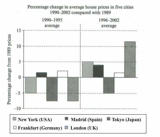 The chart below shows information about changes in average house prices in five different cities between 1990 and 2002 compared with the average house prices in 1989.