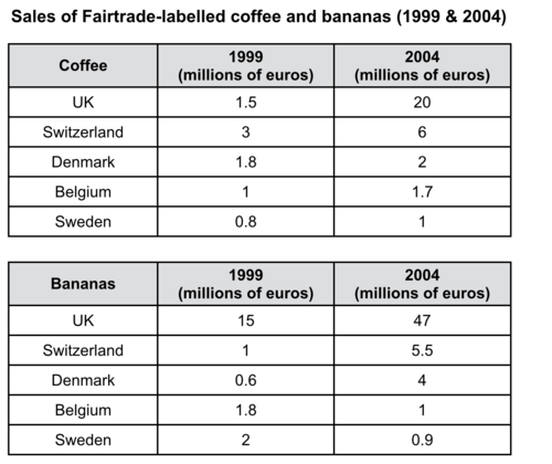 QUESTION PAPER 5The tables below give information about sales of Fairtrade-labelled coffee and bananas in 1999 and 2004 in five European countries.