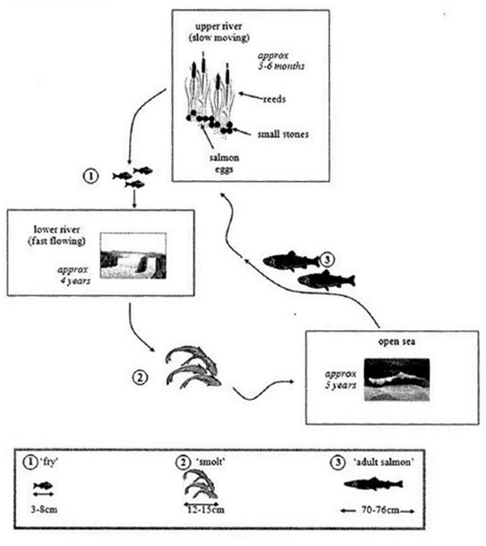 The diagrams below show the life cycle of a species of large fish called the salmon.