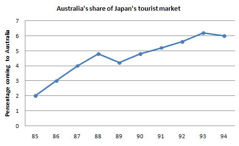 The charts below show the number of Japanese tourists travelling abroad between 1985 and 1995 and Australia’s share of the Japanese tourist market.
