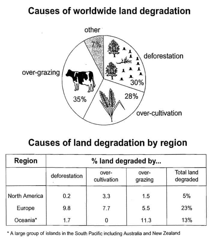 QUESTION PAPER 5The pie chart below shows the main reasons why agricultural land becomes less productive. The table shows how these affected three regions of the world during the 1990s.
