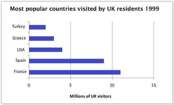 France was the favourite destination to British travellers as more than 10 million British travelled there in 1999. With around 2 million UK tourists, Turkey was their least preferred holiday place. Spain was visited by approximately 8 million UK travellers which made it the second most popular destination this year. USA and Greece received the third and fourth most-visited places by UK tourists with between 2 to 3 million tourists each.