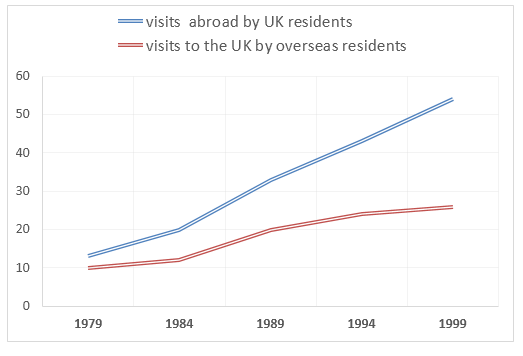 In details, 10 million tourists visited the United Kingdom in 1979 while around 13 million British spent their holidays out of the country. From 1979 to 1999, the outbound UK residents’ number was higher than the inrush of foreign tourists in the UK. The gap widened in later years, and finally in 1999, almost 55 million British left the country to travel outside while just over 25 million other nationalities entered the UK border as tourists.