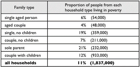 It is noticeable that levels of poverty were higher for single people than for couples, and people with children were more likely to be poor than those without. Poverty rates were considerably lower among elderly people.