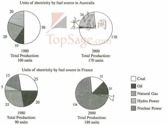 Australia depended on hydro power for just under 25% of its electricity in both years, but the amount of electricity produced using this type of power fell from 5 to only 2 units in France. Oil, on the other hand, remained a relatively important fuel source in France, but its use declined in Australia. Both countries relied on natural gas for electricity production significantly more in 1980 than in 2000. (170 words)