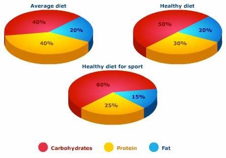 The pie charts compare the proportion of carbohydrates, protein and fat in three different diets, namely an average diet, a healthy diet, and a healthy diet for sport.