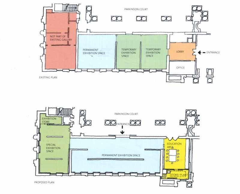 At present, visitors enter the gallery through doors which lead into a lobby. However, the plan is to move the entrance to the Parkinson Court side of the building, and visitors will walk straight into the exhibition area. In place of the lobby and office areas, which are shown on the existing plan, the new gallery plan shows an education area and a small storage area.