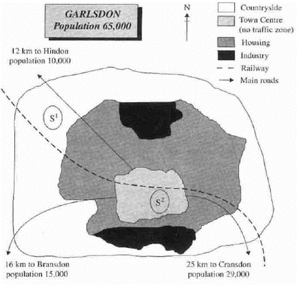 There are main roads from Hindon, Bransdon and Cransdon to Garlsdon town centre, but this is a no traffic zone, so there would be no access to S2 by car. By contrast, S1 lies on the main road to Hindon, but it would be more difficult to reach from Bransdon and Cransdon. Both supermarket sites are close to the railway that runs through Garlsdon from Hindon to Cransdon. (171)