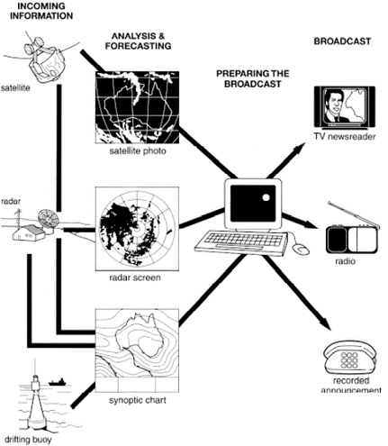 The diagram below shows how the Australian Bureau of Meteorology collects up- to-the- minute information on the weather in order to produce reliable forecasts.