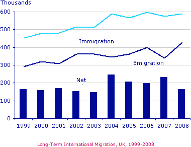 After 2004, the rate of immigration remained high, but the number of people emigrating fluctuated. Emigration fell suddenly in 2007, before peaking at about 420,000 people in 2008. As a result, the net migration figure rose to around 240,000 in 2007, but fell back to around 160,000 in 2008.
