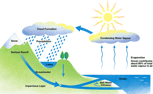 At the third stage in the cycle, rainwater may take various paths. Some of it may fall into lakes or return to the oceans via ‘surface runoff’. Otherwise, rainwater may filter through the ground, reaching the impervious layer of the earth. Salt water intrusion is shown to take place just before groundwater passes into the oceans to complete the cycle.