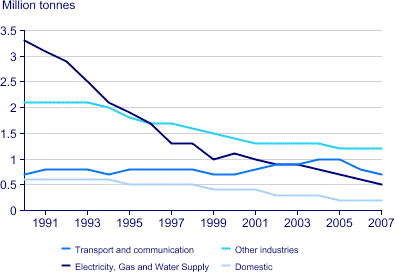 Emissions from electricity, gas and water supply fell dramatically to only 0.5 million tones in 2007, a of almost 3 million tones. While acid rain gases from the domestic sector and other industries fell gradually, the transport sector a small increase in emissions,