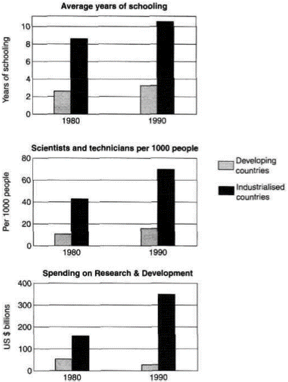 The charts below show the levels of participation in education and science in developing and industrialised countries in 1980 and 1990.