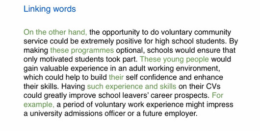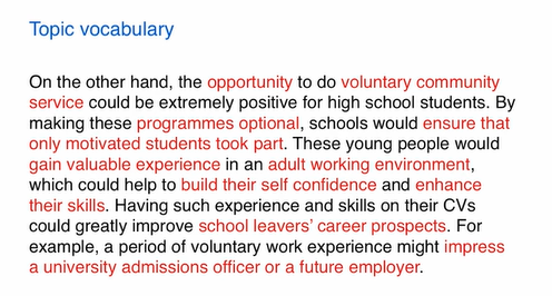 (Topic sentence) On the other hand, the opportunity to do voluntary community service could be extremely positive for high school students. (Explain) By making these programmes optional, schools would ensure that only motivated students took part. (Explain) These young people would gain valuable experience in an adult working environment, which could help to build their self-confidence and enhance their skills. (Explain) Having such experience and skills on their CVs could greatly improve school leavers’ career prospects. (Example) For example, a period of voluntary work experience might impress a university admissions officer or a future employer.