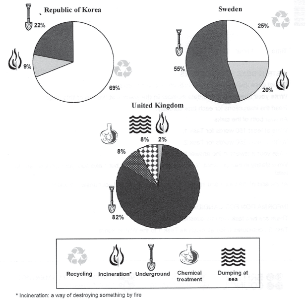 The charts compare Korea, Sweden and the UK in terms of the methods used in each country to dispose of harmful waste.