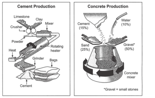 The first diagram illustrates the process of cement manufacture, and the second diagram shows the materials that go into the production of concrete.