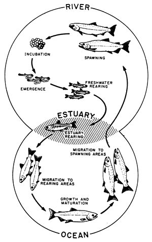 Salmon begin their lives in rivers where the adult fish lay and incubate their eggs. After emerging from eggs, the young salmon spend the next stage of their lives being reared in freshwater areas. Then, at some point in their development, the fish swim downstream to river estuaries where rearing continues.