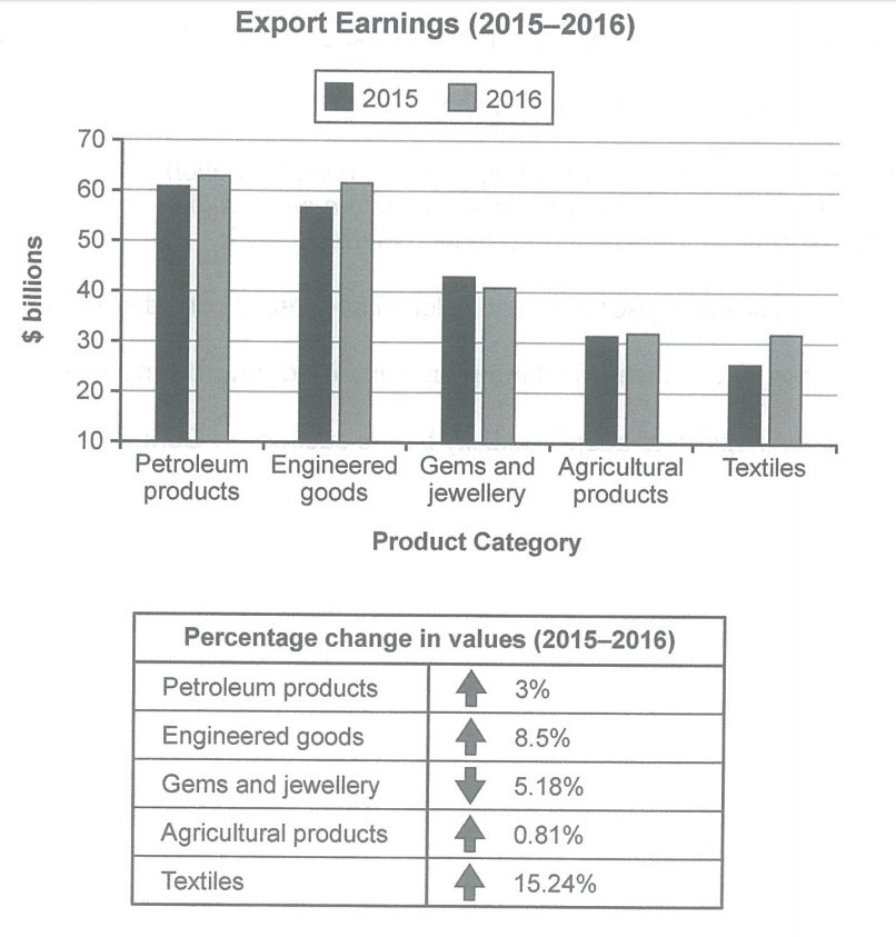 The bar chart and table give information about a country’s export earnings from five groups of products in 2015 and 2016.