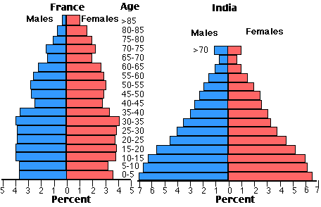 The charts below compare the age structure of the populations of France and India in 1984.