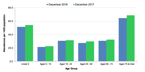 Looking first at the older age groups, roughly 65 people, per 1000 population, aged 75 and over attended A&E wards in December 2016, and this rose to almost 70 attendances per 1000-population one year later. Interestingly, those aged 65 to 74 were less than half as likely to require emergency treatment, with around 30 attendances per 1000-population in both months.